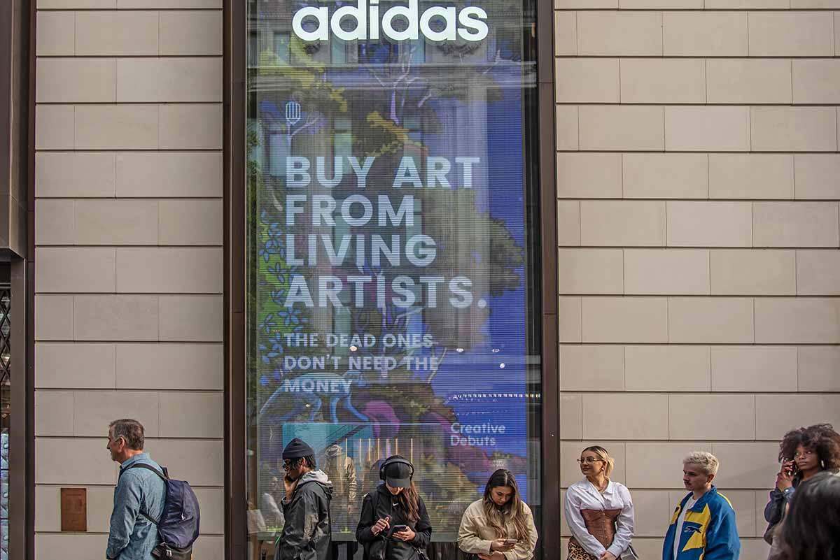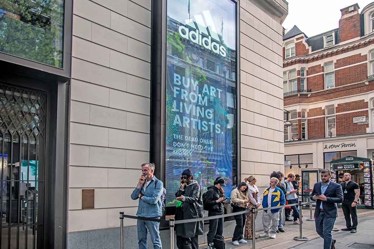 Adidas London. People queueing to get in. Photo by Street Art Atlas